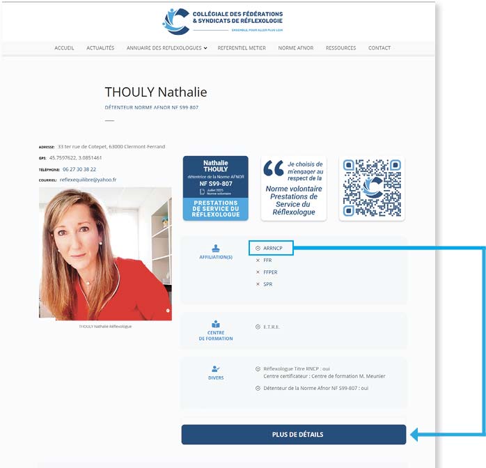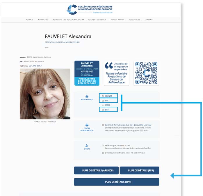 Les fiches professionnelles sont à présent liées aux annuaires d’affiliation des réflexologues. Les visiteurs peuvent donc désormais accéder à des informations complémentaires (tel que le site internet du praticien).